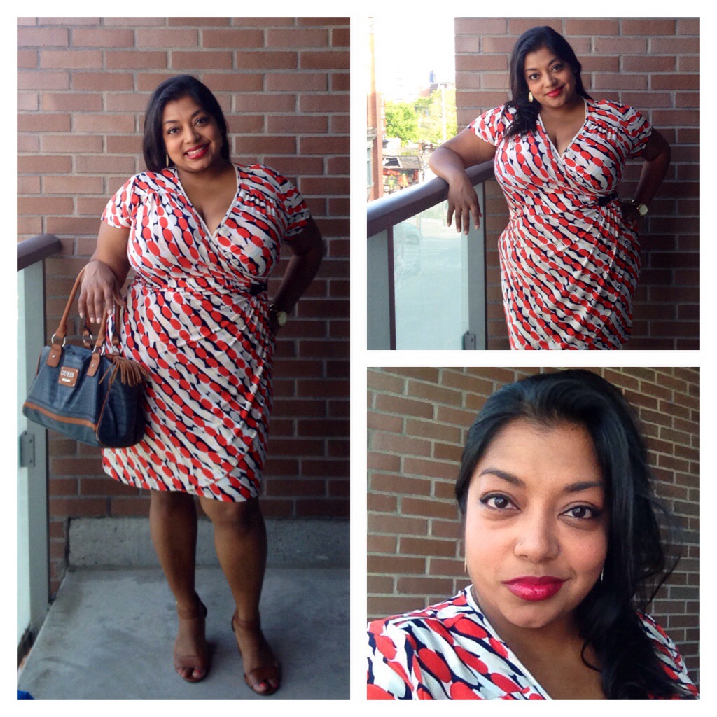 Coral & navy patterned faux wrap dress from Rainbow Clothing; Brown sandals from Payless; Purse from Guess; Gold bracelet Michael Kors watch + gold drop earrings AND new fantastic lipstick: Rouge Artist Intense by Make Up Forever