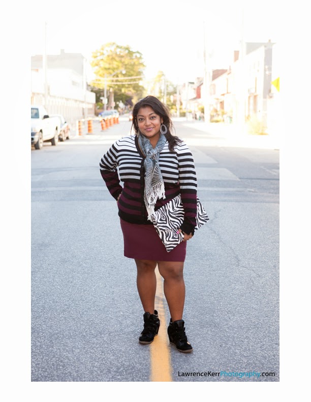 Fall is all about sweater weather! So to take this look into a more cozy vibe….simply replaced the leather jacket for a tri-toned open cardi sweater (Winners) and did up my hot pink gold studded belt (Your Big Sister’s Closet) over top of it, to cinch in my waist and create a nice casual hour-glass shape. And of course, my paten leather stripped Kate Spade purse to complete both looks.