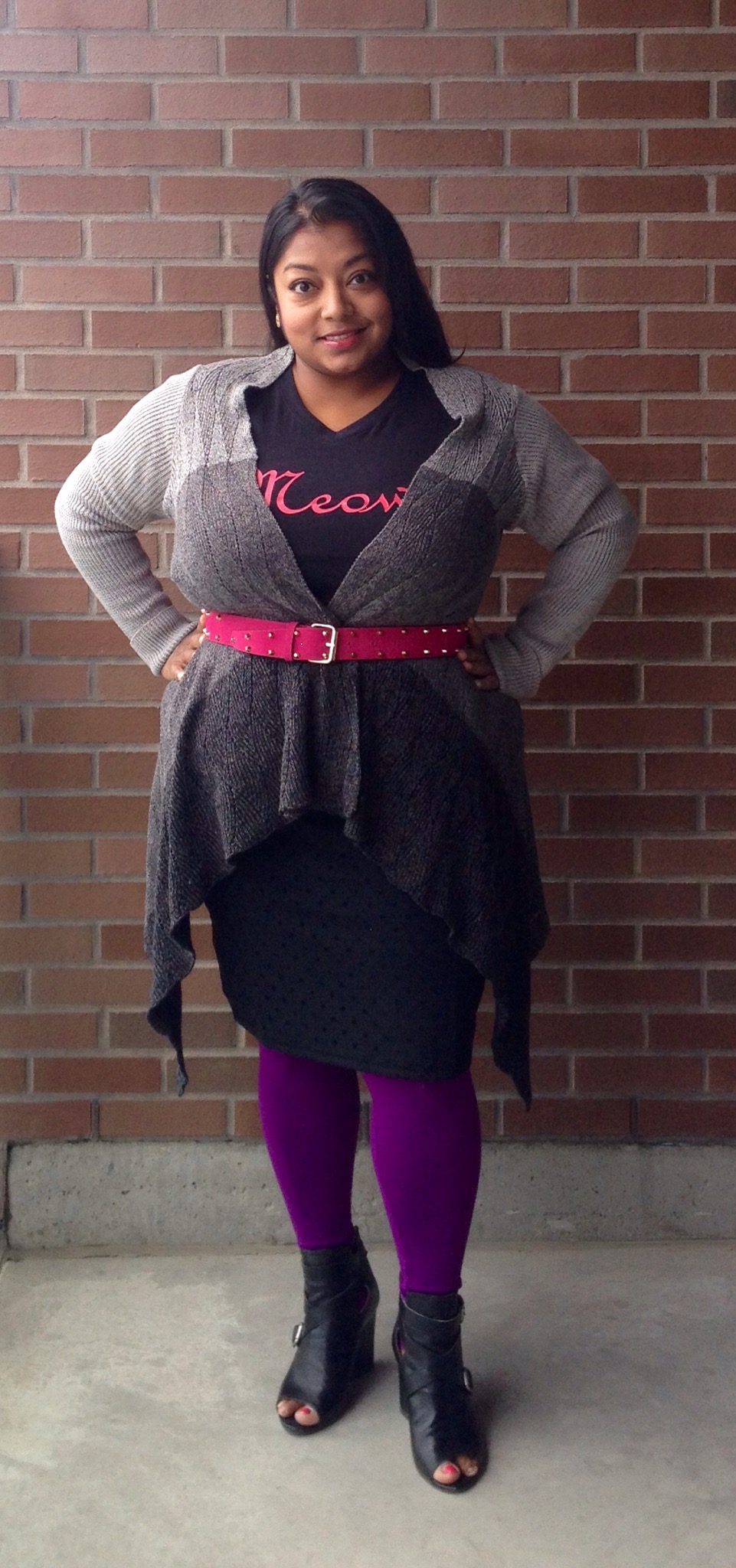 I couldn’t help myself … chose to break up the ALL black look with a hot pink studded belt (Your Big Sister’s Closet) and purple leggings (Old Navy) for extra Fall warmth.