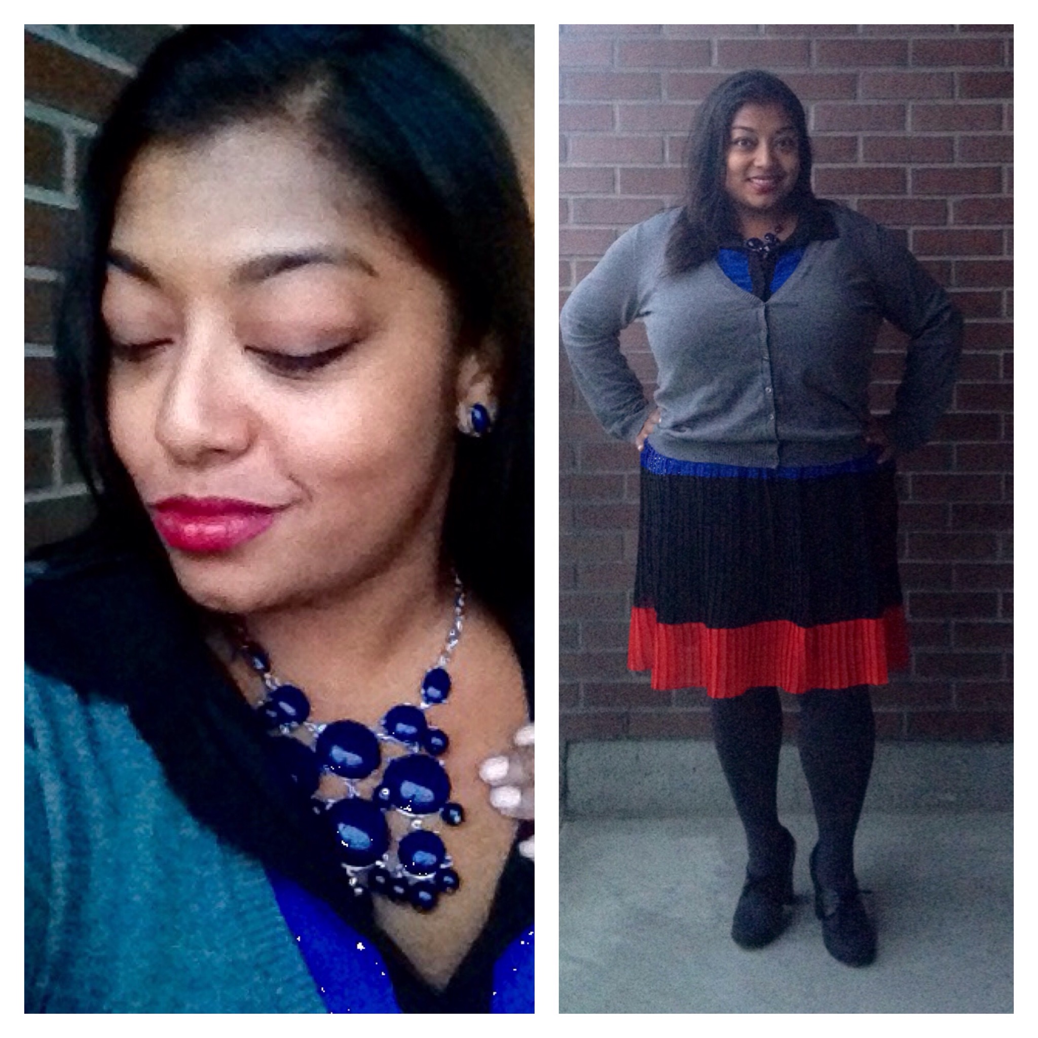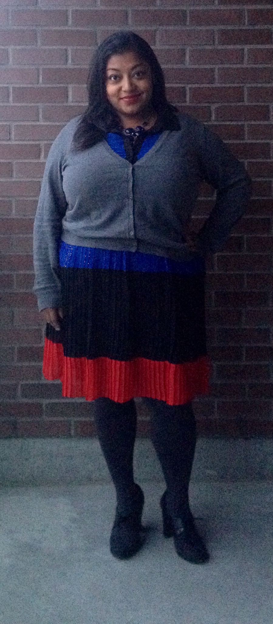 How I Got The Look: Shadow grey tights,Sonsee Woman; Grey & black maryjane shoes, Nine West; Tri-coloured pelted sheer-dress, BIGDeal Toronto pop-up sale; Grey cardi, Old Navy; Statement necklace and earrings set from LOFT.