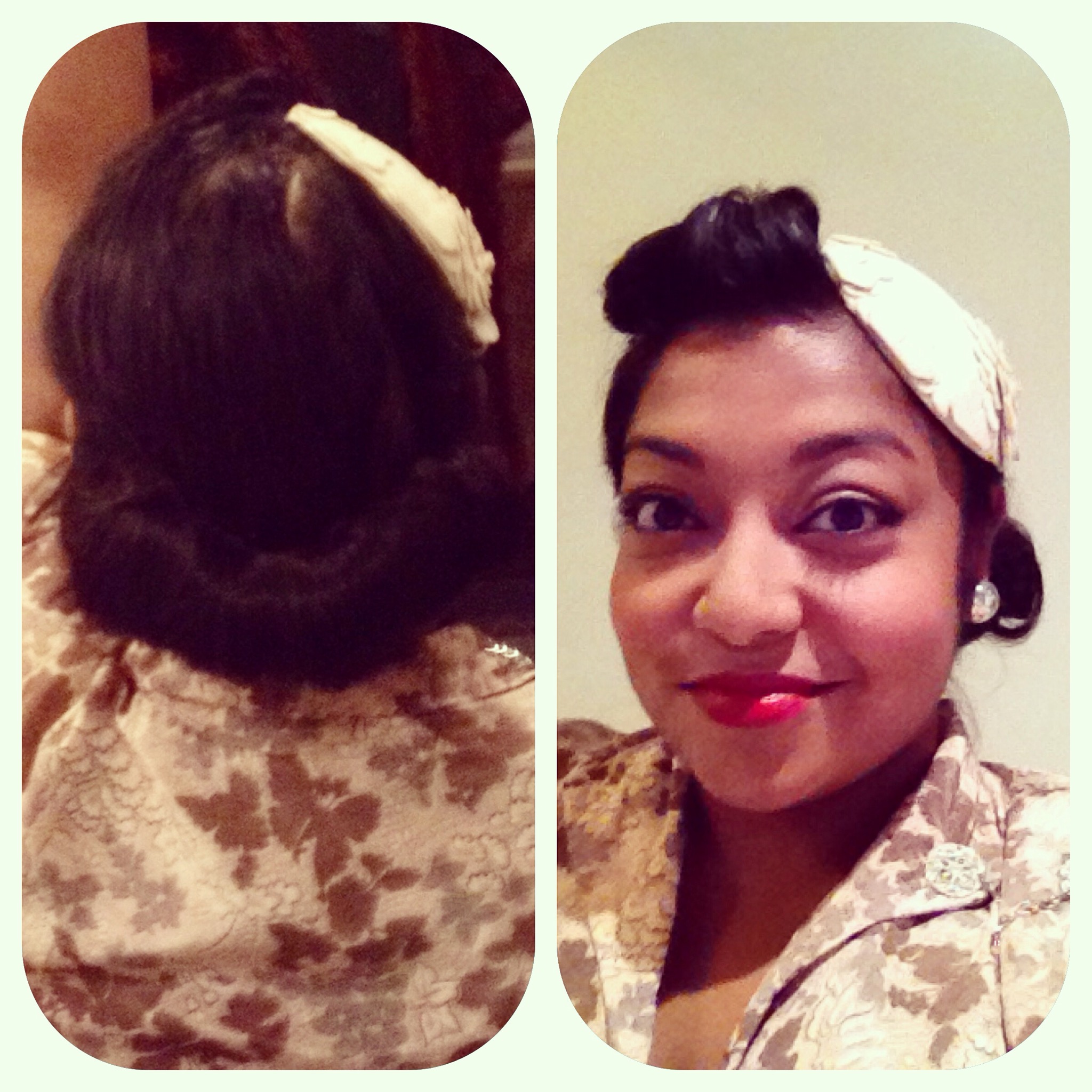 The hair is always my biggest challenge. Liz, of The Vintage Inn, gave me a great easy tip and I was able to create this vintage back-roll…which held up pretty well all night!