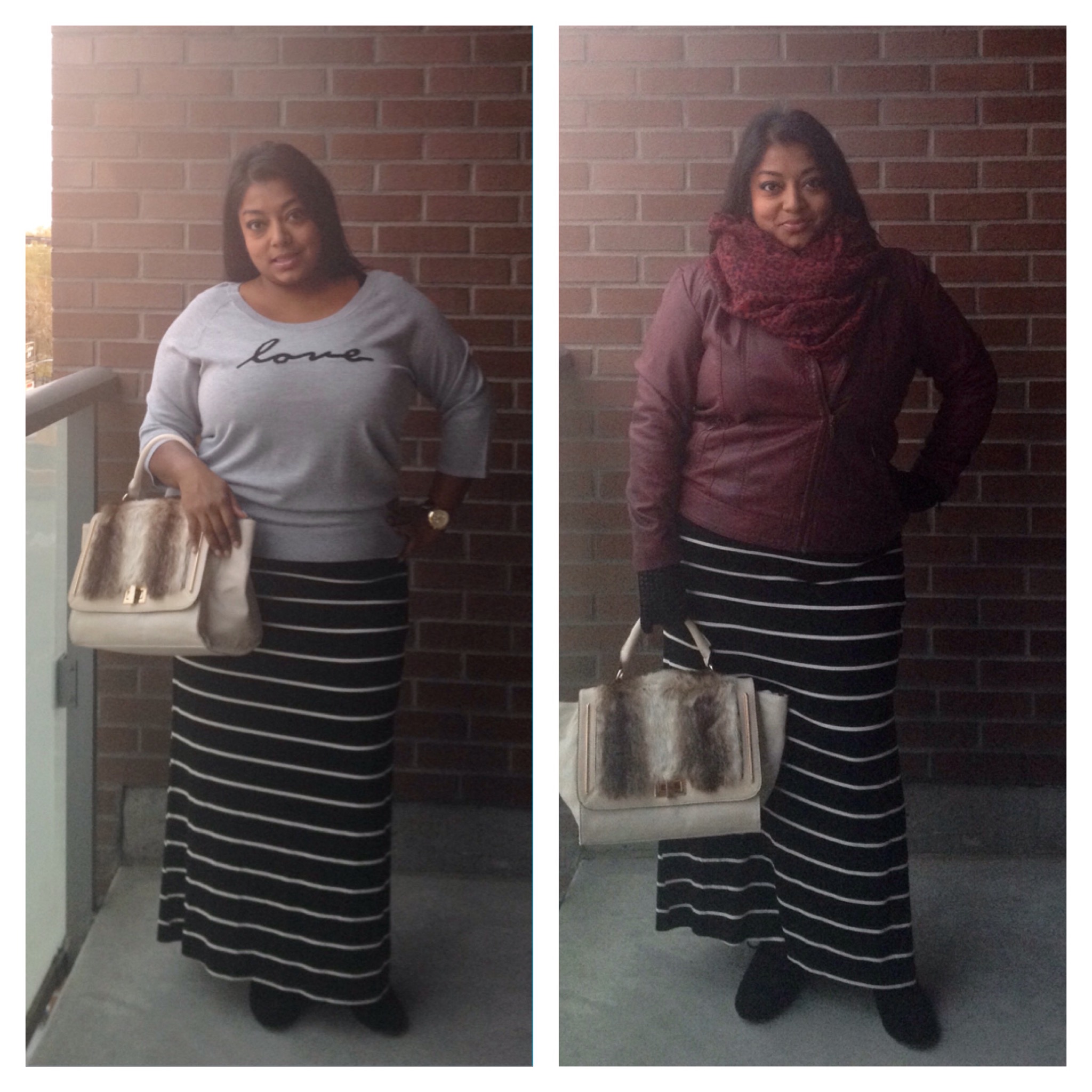 ‘Love’ sweater $19 …. Black n’ White striped maxi skirt $19 ….Wine moto jacket $59