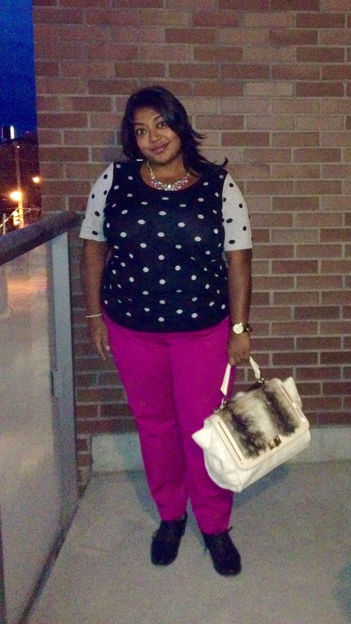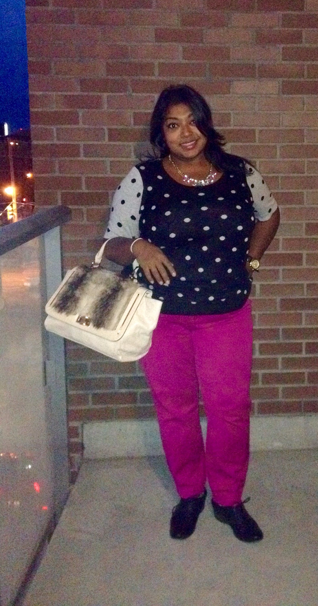 Fuchsia pants from Old Navy; Polka-dot sweater from Reitmans; Fur bag from Aldo Accessories; Shoes from Rockport; Statement necklace & earrings from LOFT; Gloves from Danier Leather; Jacket from Forever21+; Michael Kors bracelet watch; Beige scarf from Winners; Fur hat…sorry friends, I don’t remember