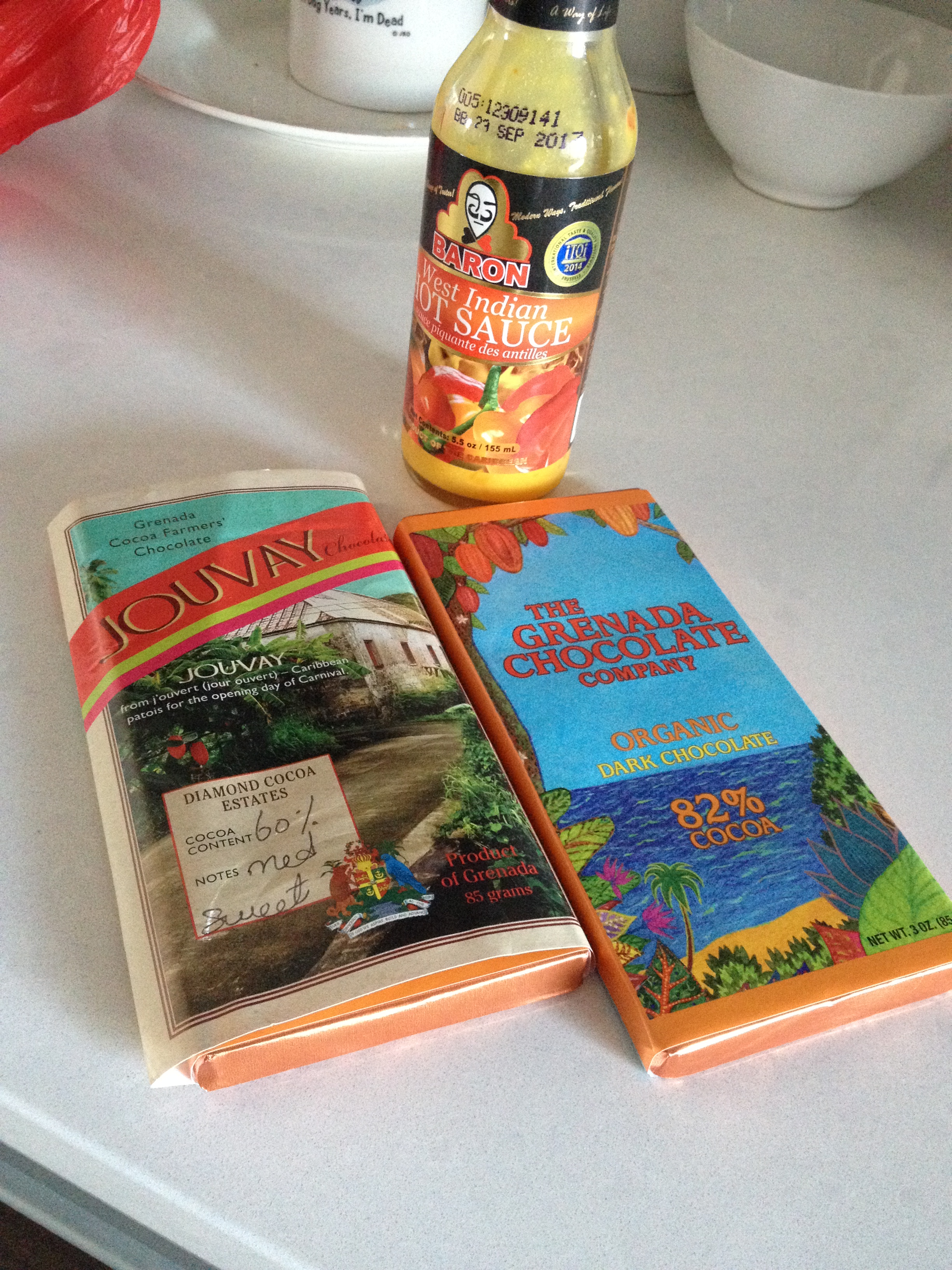 I did very little shopping while I was there. I did bring back with me bars of Grenada’s finest dark chocolate from both Jouvay and The Grenada Chocolate Company. AND a bottle of the fantastic West Indian hot sauce. As you can see I’ve used much of it already since being home. I’m a fan – the spicier the better 😉