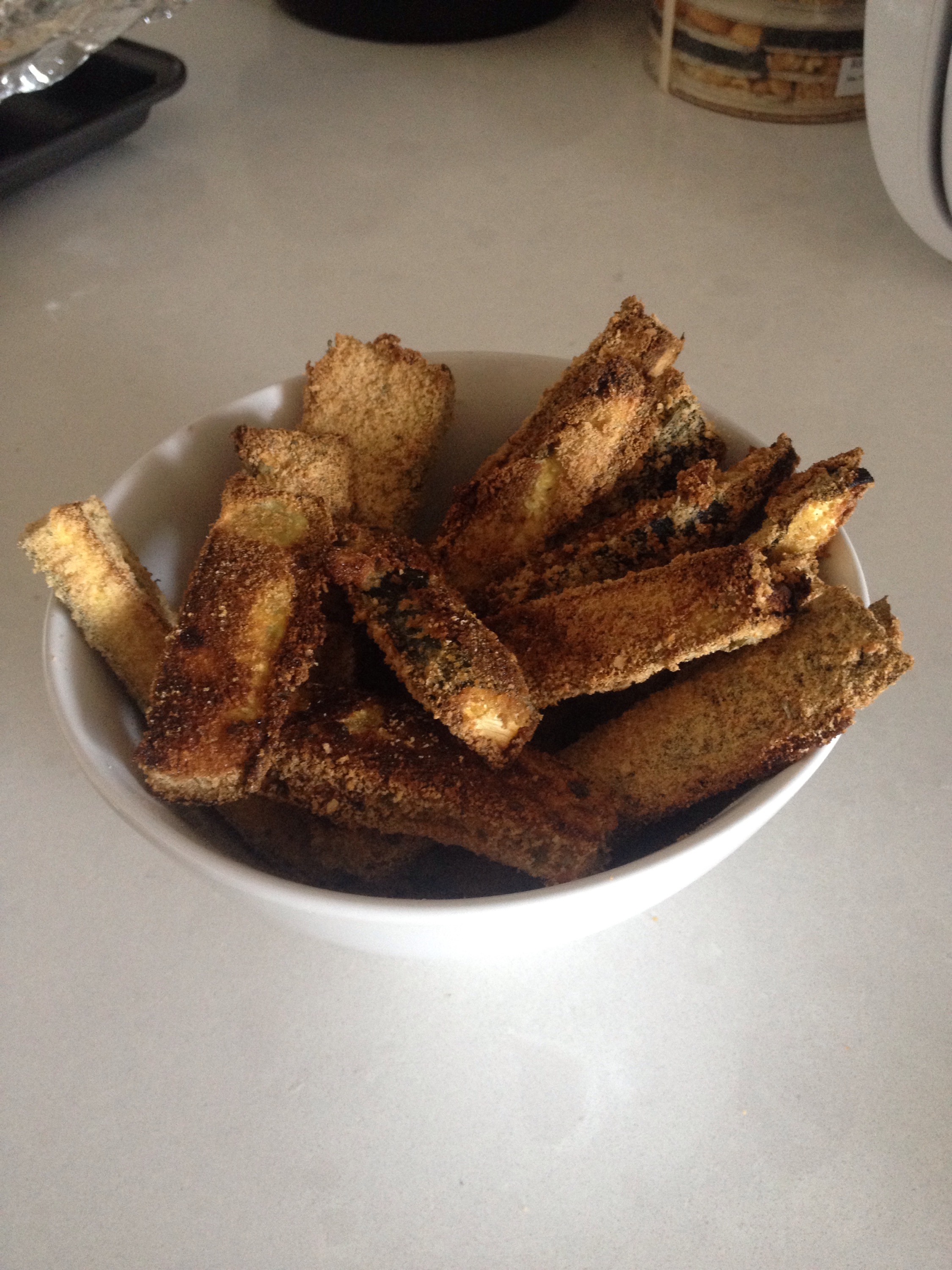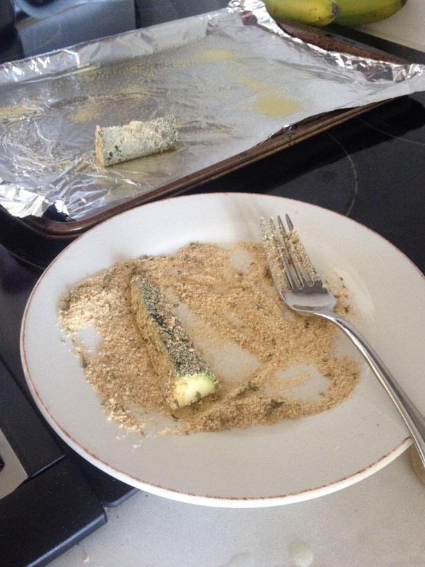 STEP 1: Preheat oven to 425° and coat a baking sheet with cooking spray.STEP 2: Whisk an egg white in a small bowl, and add milk. Add ground pepper and salt here if you like.STEP 3: Cut zucchini into 3-inch sticks and STEP 4: Dip zucchini sticks into egg mixture.STEP 5: Then roll each stick into the breadcrumb mixture (combine parmesan and seasoned breadcrumbs in a separate bowl. I’ve used store bought PC Italian Herb breadcrumbs. OPTION: You could use that Japanese panko crumbs too!STEP 6: Place zucchini on sheet. Bake for 25–30 minutes or until golden brown. (FYI: This is the amount 1 zucchini yielded.)STEP 7: Eat them!