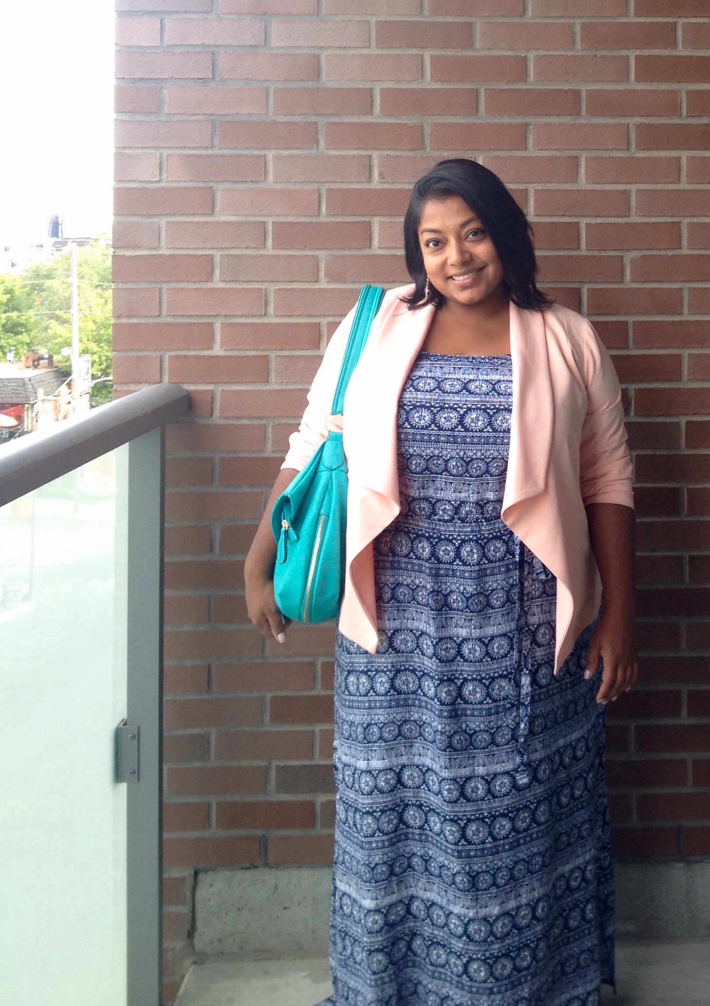 How I Got The Look: Blush blazer, Dorothy Perkins; Maxi dress, Forever21+, Aqua sandals, Birkenstock, Aqua purse, Aldo Accessories