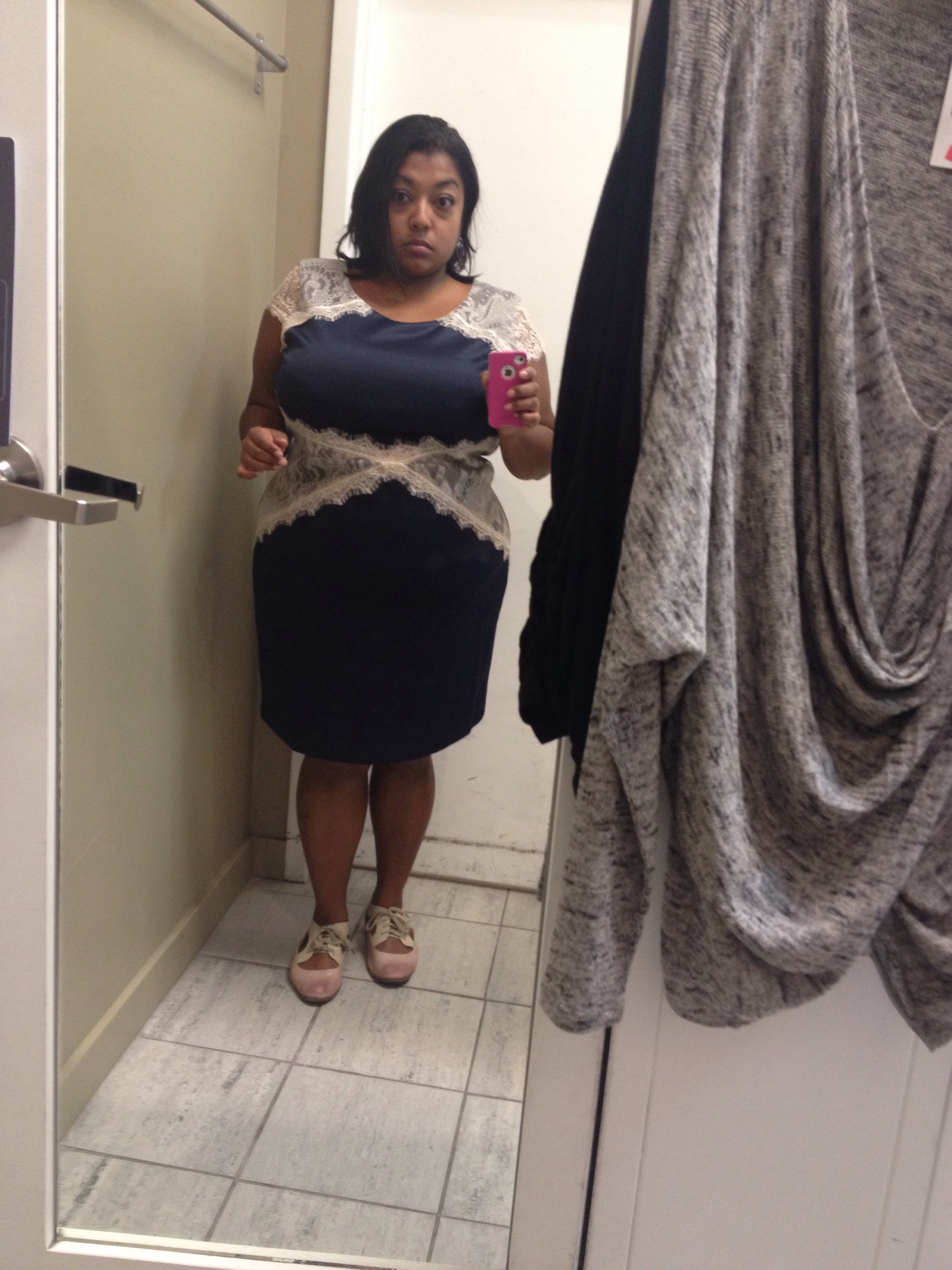 Faux wrap aztek printed dress – I’m wearing a 3x …way too big on me and am clearly not impressed by the baggy boob situation. LOL!This navy scuba dress with beige lace wasn’t bad. But it wasn’t making me excited about it either… Meh! I dunno…