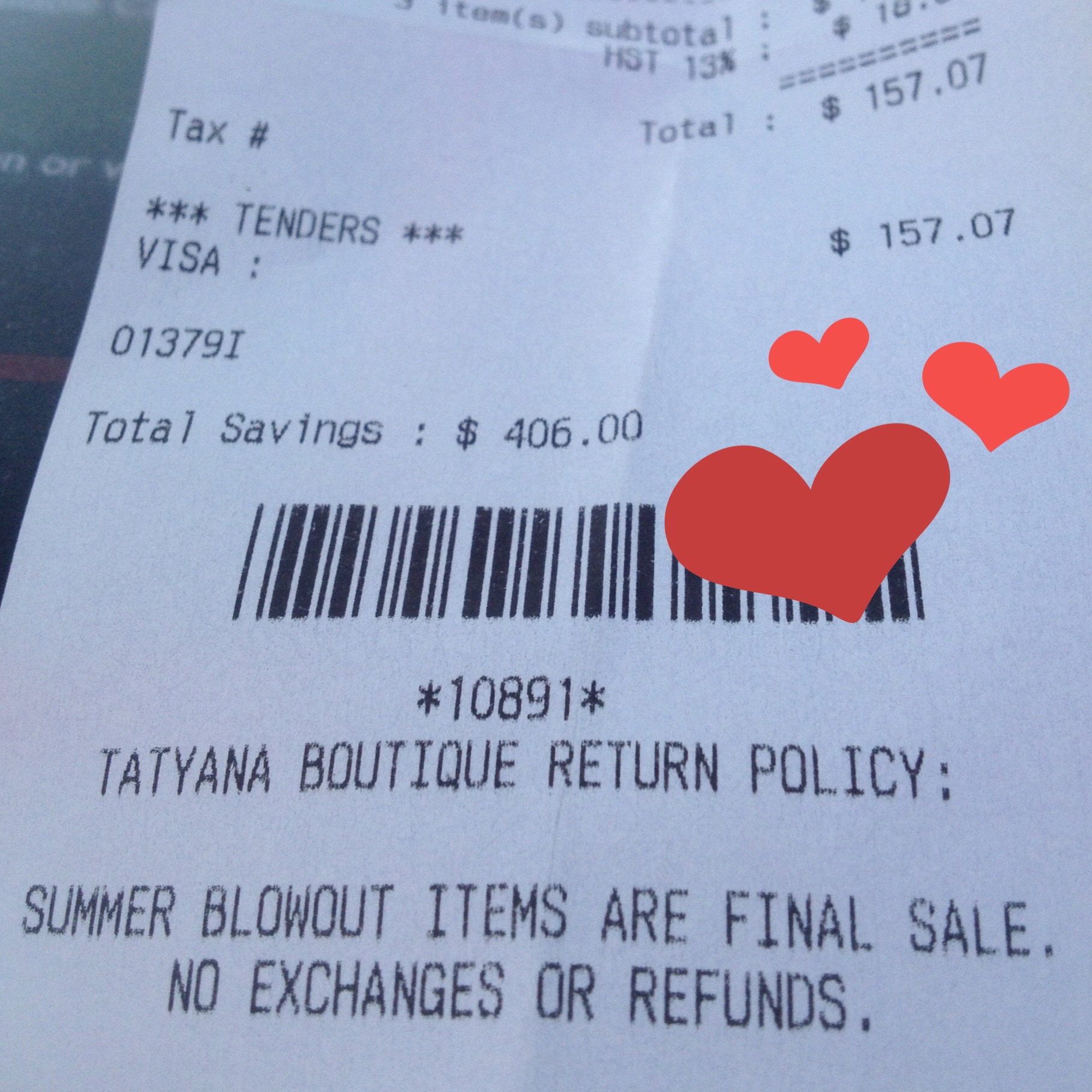 Just look at my receipt below from an unexpected shopping trip I made last week – when I got an email from Tatyana Boutique saying that it was THE LAST day to get 50% off everything in store INCLUDING already reduced items!!
