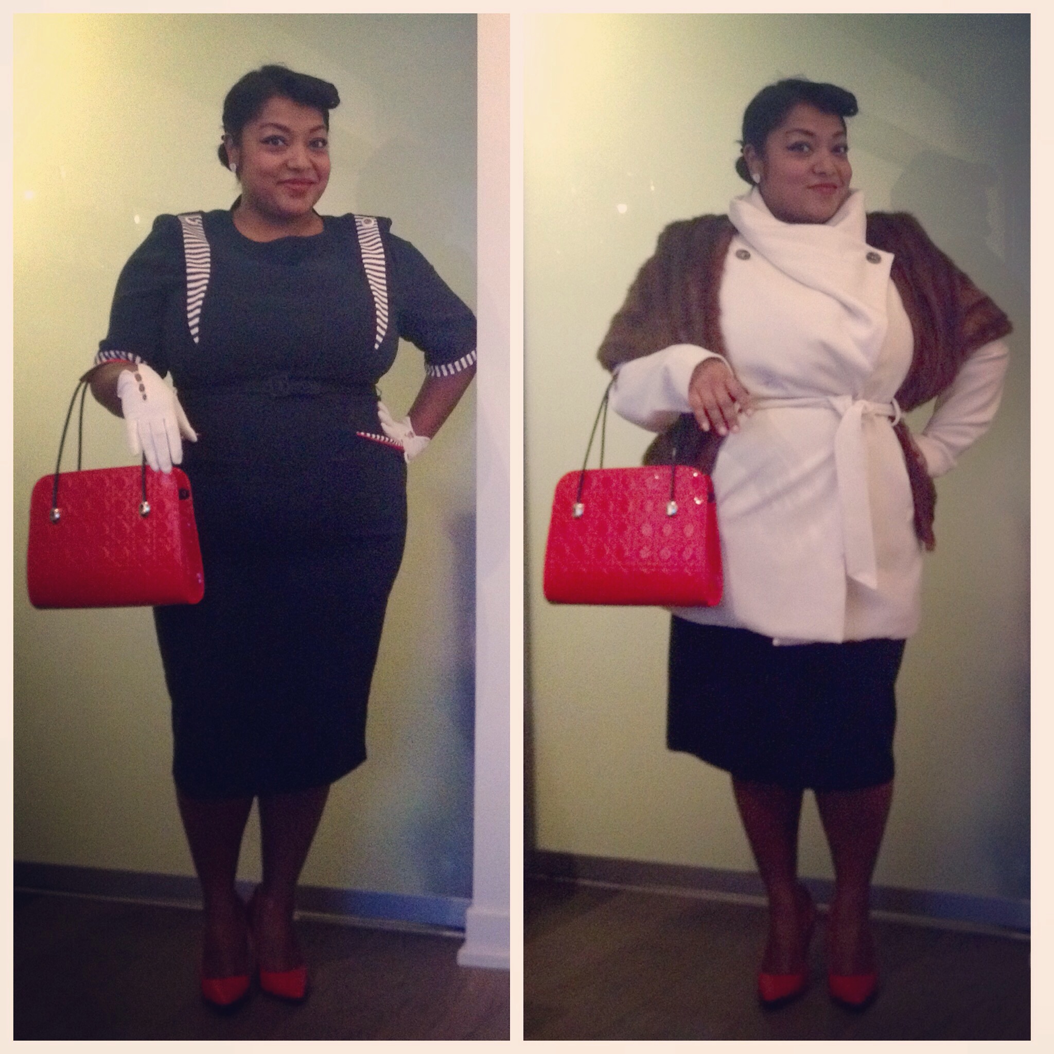 Right picture: Purse and Dress from Tatyana Boutique, Shoes from Aldo, Gloves from 69Vintage