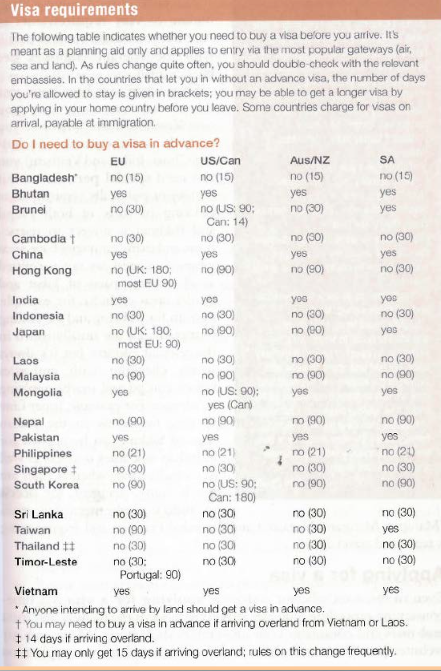 This table gives a broad outline of visa requirements in Asia, You should confirm the details of a visa requirements for a particular country before travelling as rules at each embassy changes often. The forms can be lengthy and may require you to hunt down info that you may not know off-hand. So, best to start the visa process early, if you can.