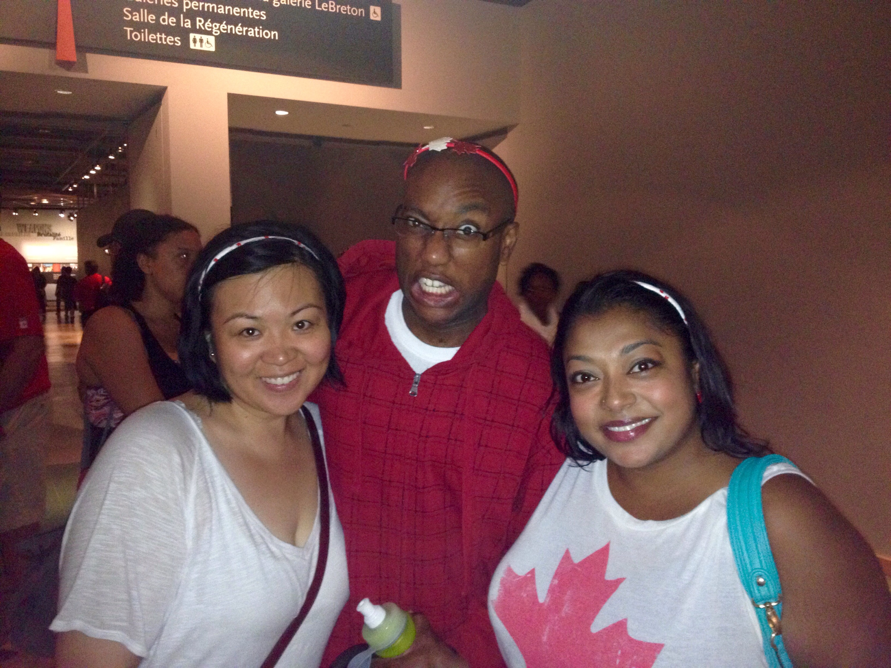 Three proud patriotic, rained-on Canadians, ready to explore the War Museum on Canada Day