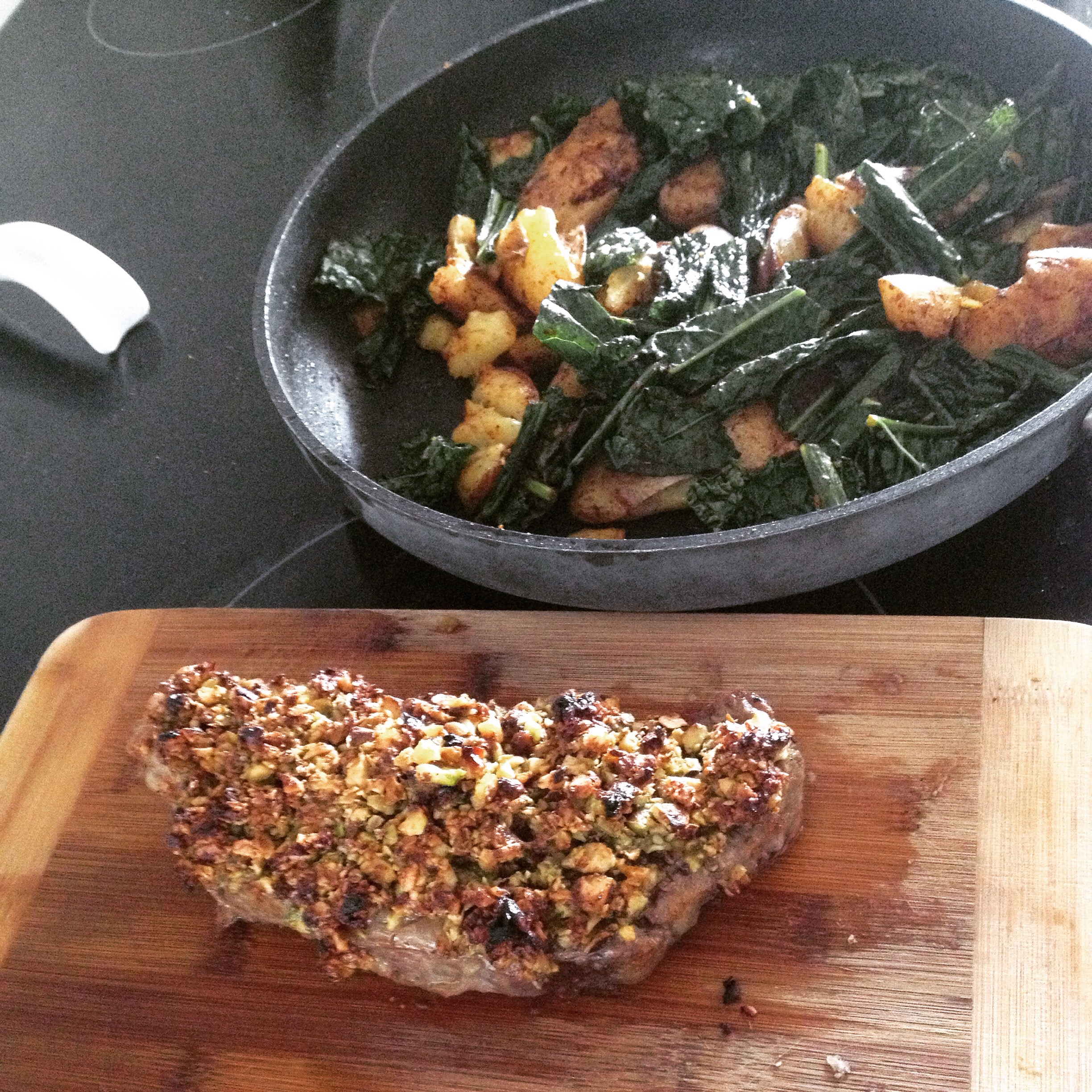 MEAL 2: PISTACHIO CRUSTED STEAK with smashed fingerling potatoes and dino kale