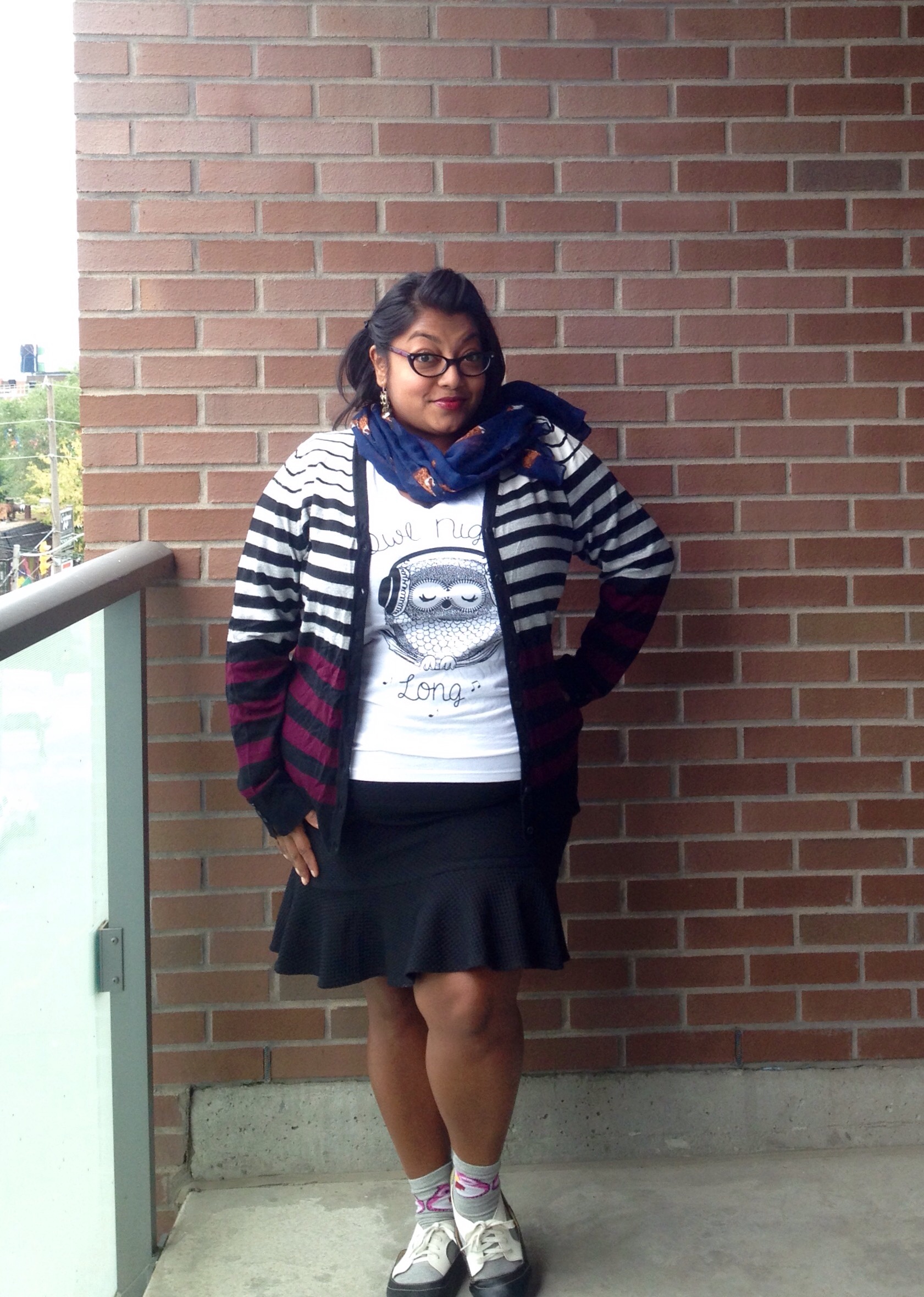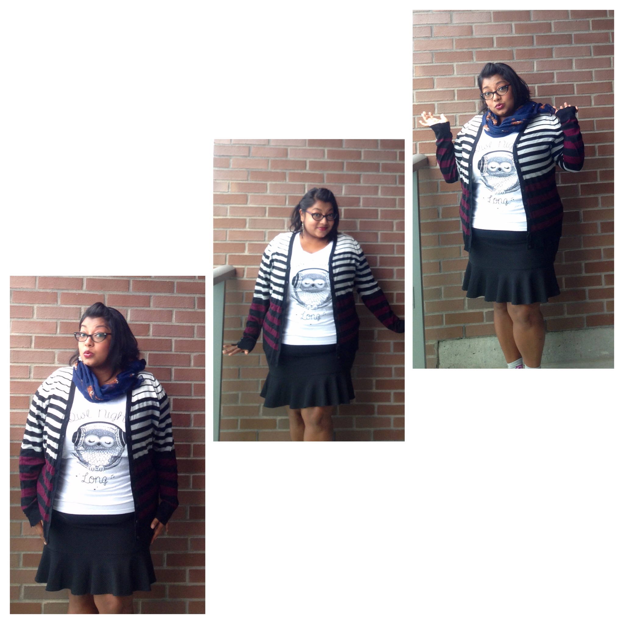 How I Got The Look: Striped sweater & skirt, Reitmans (click here for other looks); Owl-Night-Long tee, La Vie En Rose; Owl socks, Ardene; Shoes, Winners