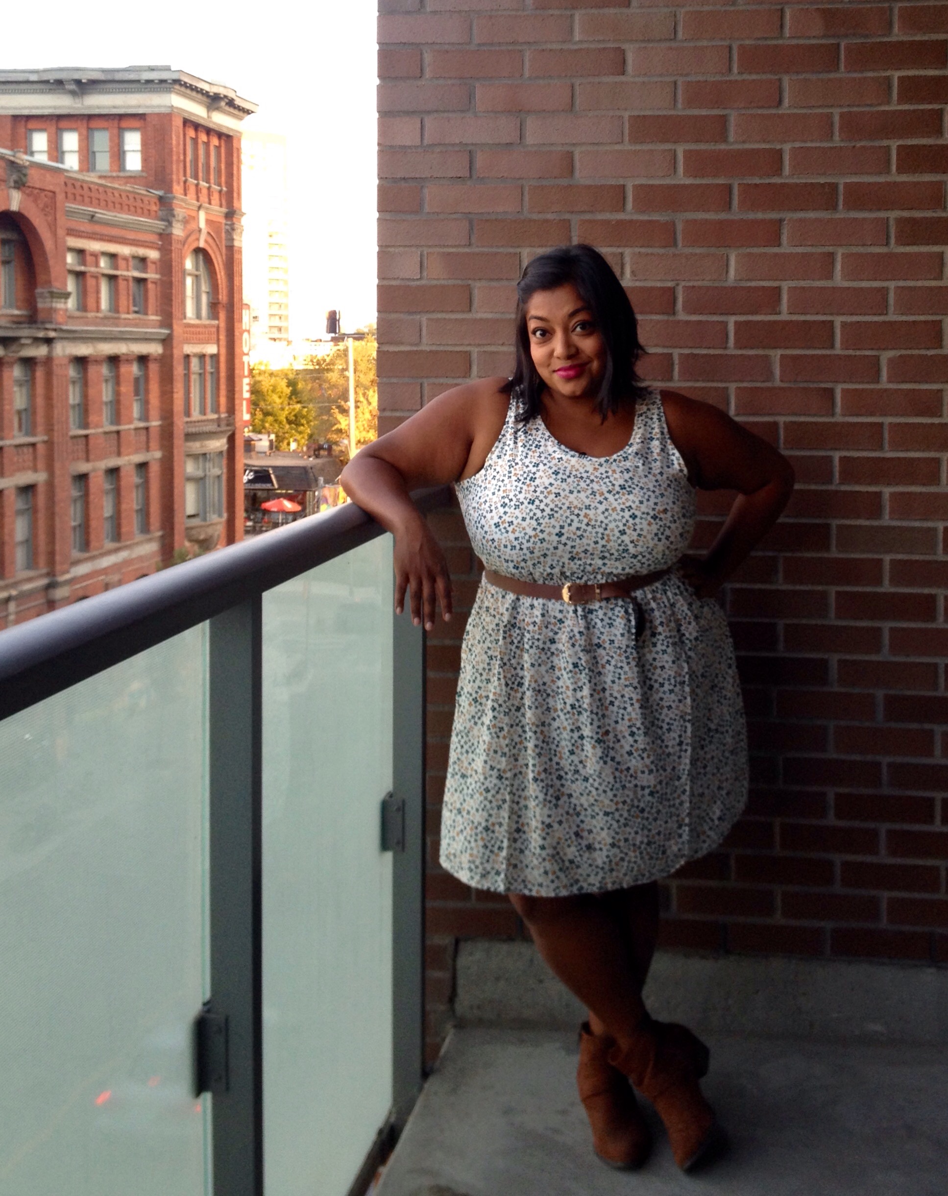 How I Got The Look: Acid pink swing dress, AdditionElle; Black n’ white furry sweater, LauraPetites; Sliver buckle belt, Reitmans; Booties, Nine West Outlet