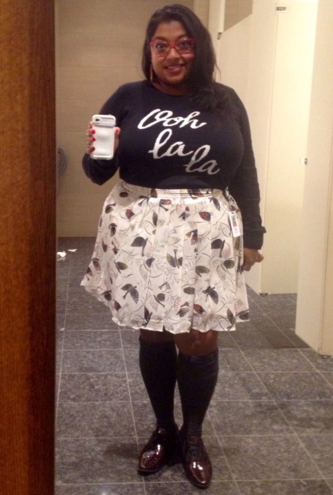 How I Got The Look…..Sweater: Old Navy (click here for other looks); Bird skirt: Old Navy (click here); Knee-high socks: Ardene; Shoes: Nine West (click here)
