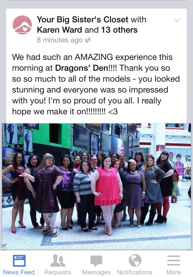Your Big Sister’s Closet’s first audition was this past Saturday – March 1st. This audition is preliminary – meaning it was with the show’s producers – these are the people who determine if we are a good fit for the show and pitching to the Dragons. Karen and Peter auditioned last year, but were not selected for the show. This time around they were prepared to blow this audition out of the water by bringing them a gorgeous fashion show – something really visual that will translate well for TV and will really WOW them! That’s where ME, along with several other plus sized beauties come in 😉
