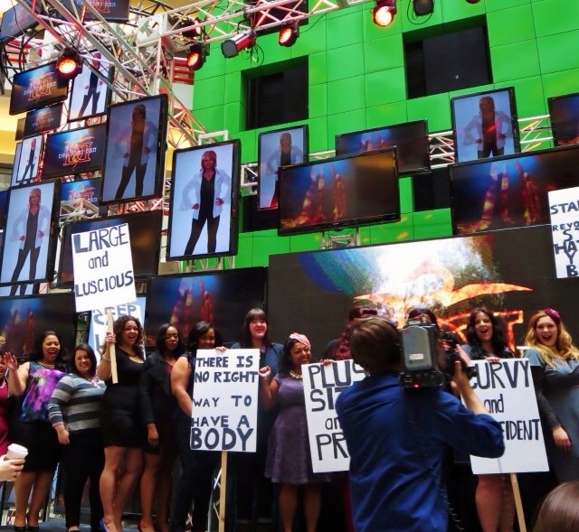 On the actual audition day, we met bright and early in the atrium of the CBC building downtown (250 Front Street West, at John Street) for 9am with our hair and make-up done as we usually do it. They brought our planned outfits and we changed there via a clever pop-up changing tent they brought along. (Brilliant!) Part of the WOW-factor to keep this audition memorable to the producers was that we were going to carry body positive picket signs that said things like “Plus Size and Proud”, “Curvy and Confident”, etc. Similar to the #BoPo Art Installation I was apart of in February for the store’s 1st year Anniversary Party.