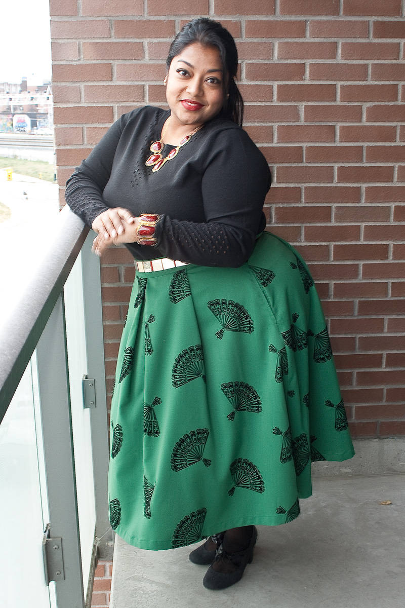 This green fanny midi skirt is pretty great – so great in fact, that I even bought it in a wine red too! Click here to see that. To make it holiday and winter ready I paired it up with a simple black sweater and jazzed it up with jewellery.