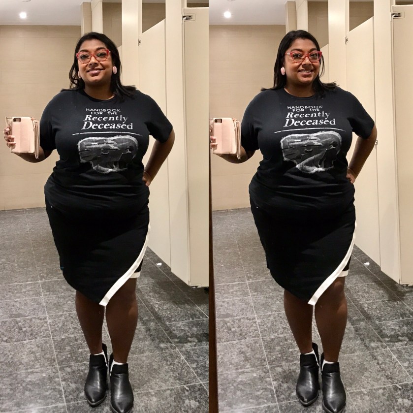 Trying for this all-black-everything look for complete with my “Handbook for the Recently Deceased ” tee (PublicButter) with this angled pencil skirt (F21+) and Black booties (Winners). Sadly this was photographed without my stripped cropped blazer, to truly give off the Beetlejuice… Beetlejuice …BEETLEJUICE vibe!