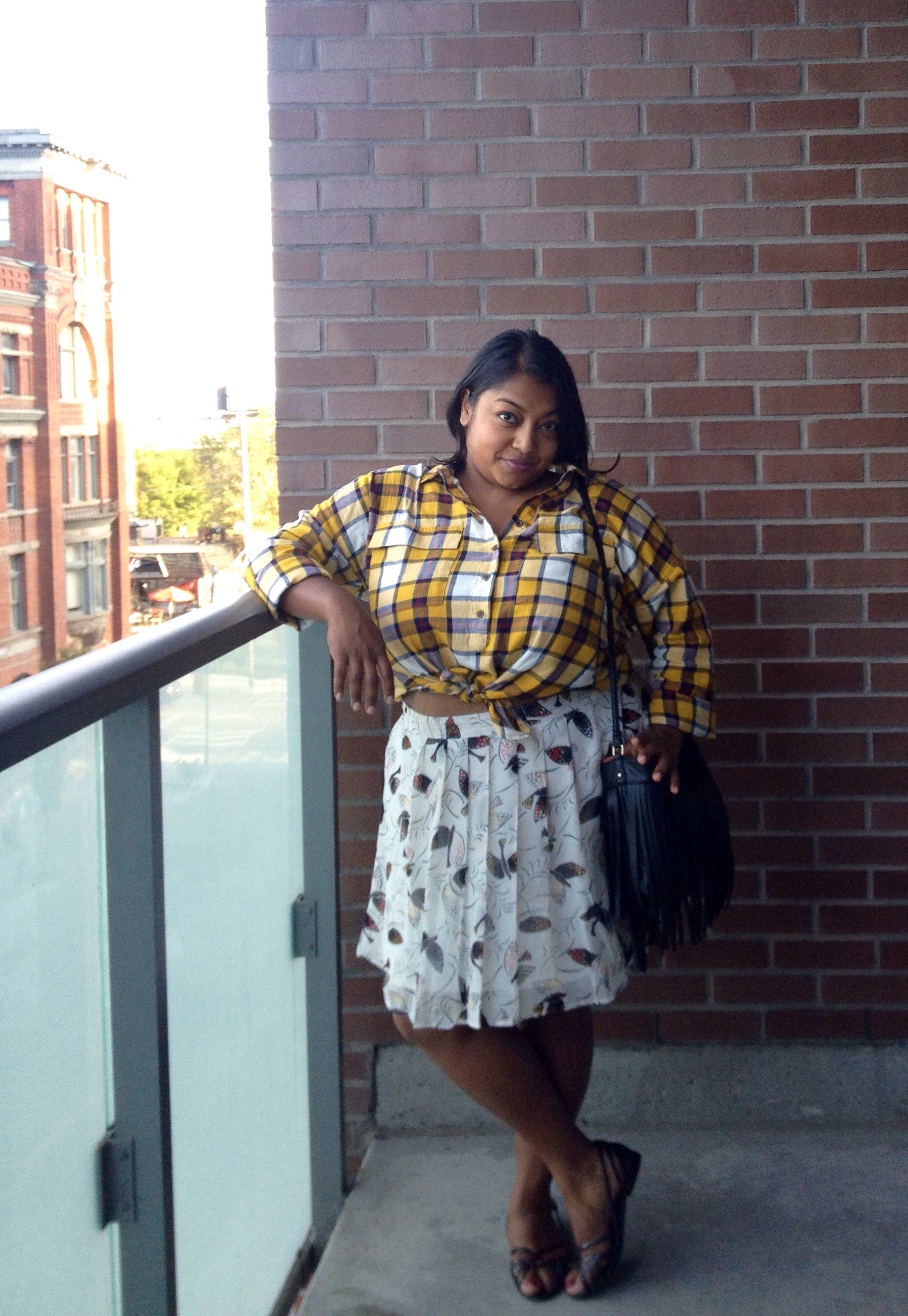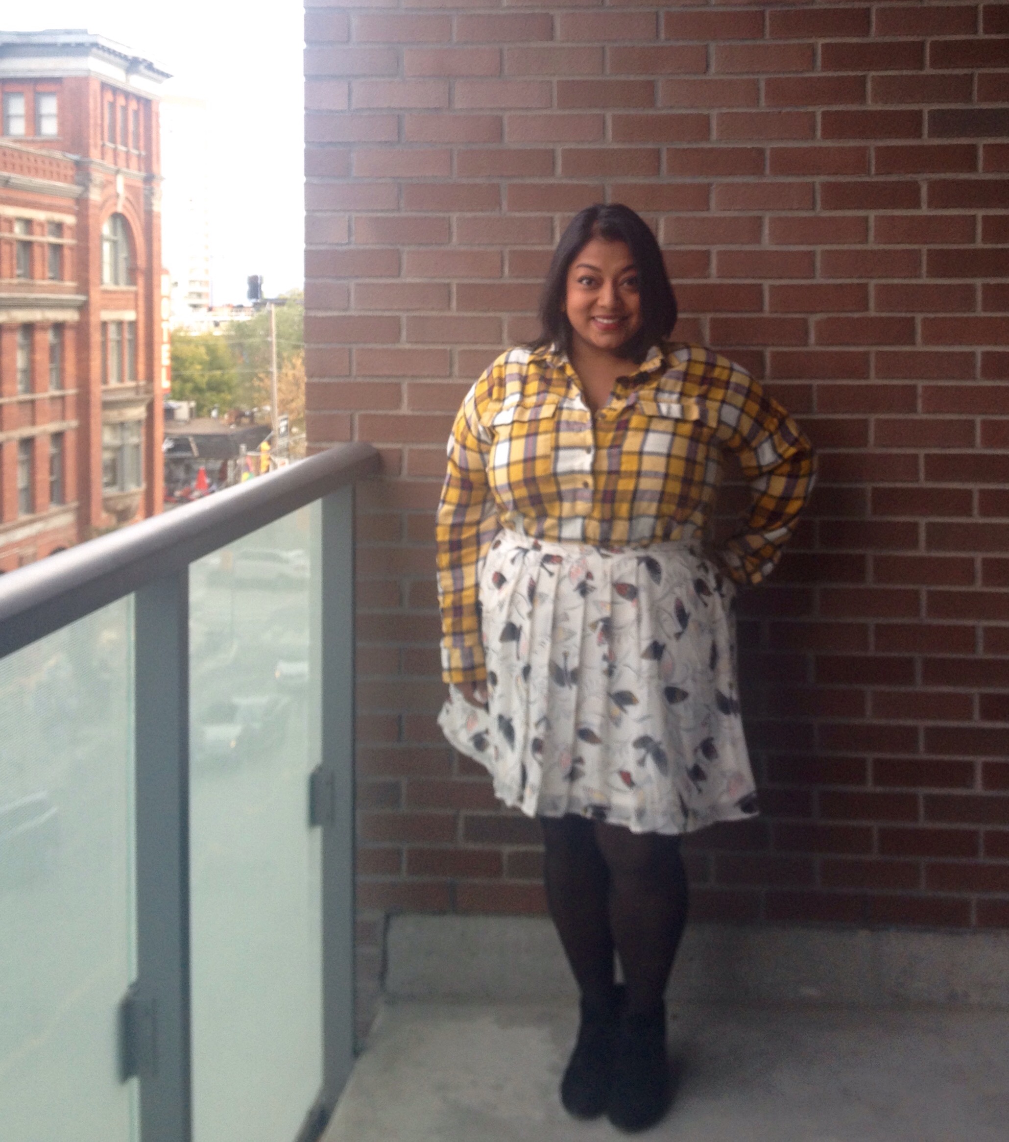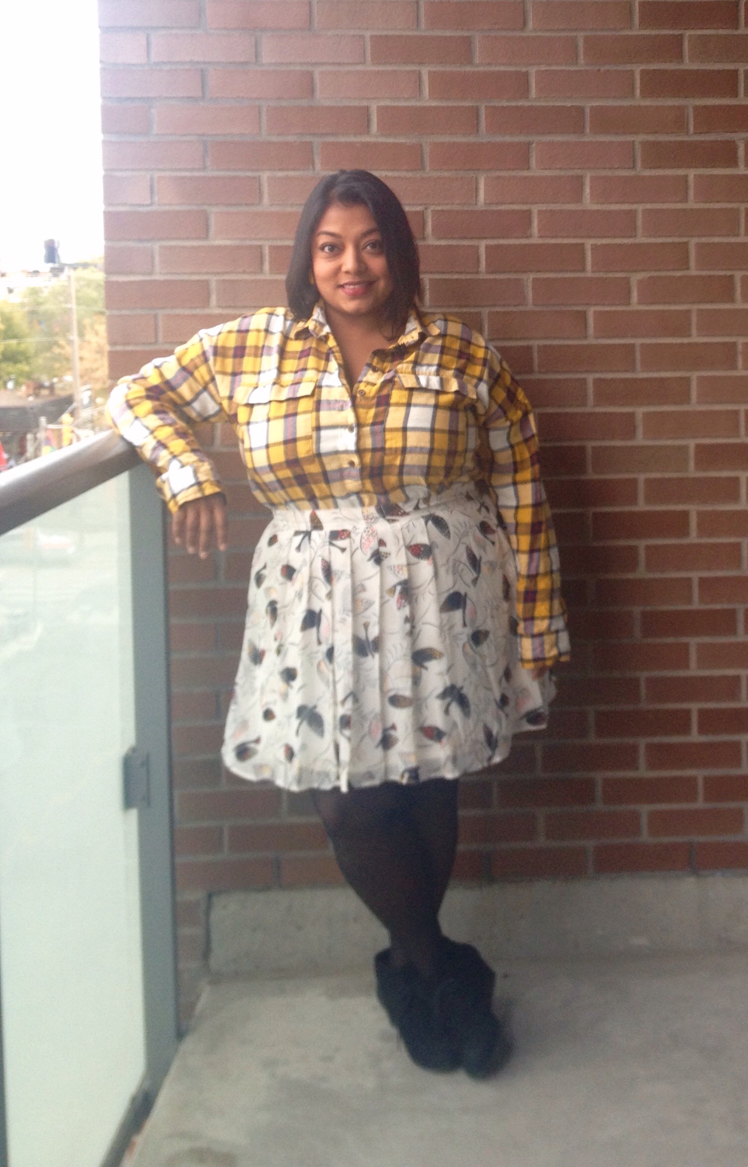 Notice that the birds of the skirt pickup the reds, blacks, and mustard colours of the plaid shirt. 😉