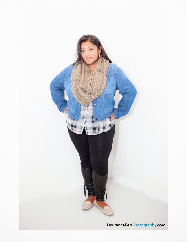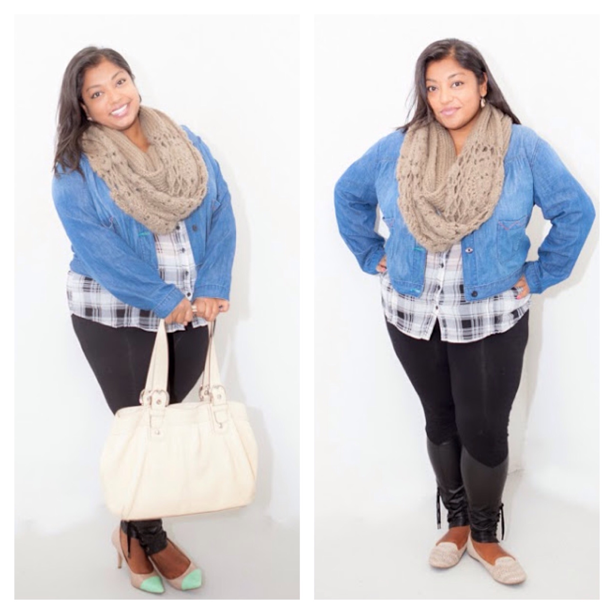 Jean jacket from Old Navy; Thick wool infinity scarf from Aldo Accessories; Black n’ white sheer plaid shirt from Reitmans; Leather calf leggings from Forever21+; Large cream Coach bag; Beige + sea foam toed heels from The Hudson Bay Co.; jewelled studded flats from Payless; extra thick infinity scarf from Aldo; andvintage bracelets from Spring’s Toronto Vintage Clothing Show