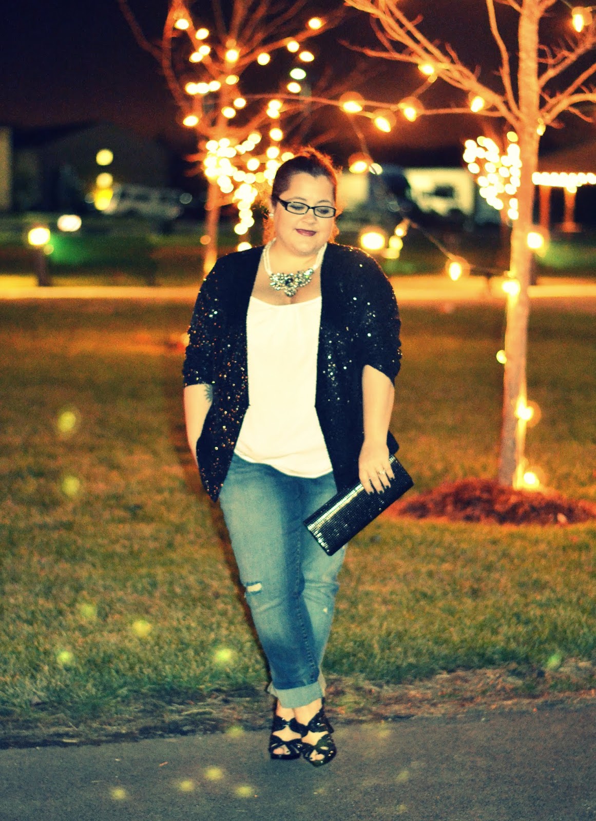 Cassie dazzles in her boyfriend jeans, black glitter heels, ivory camisole and black sequin jacket! Loving the statement necklace too! Head over to Style Cassentials for all the details on Cassie’s holiday outfit. Or visit her Facebook page here.