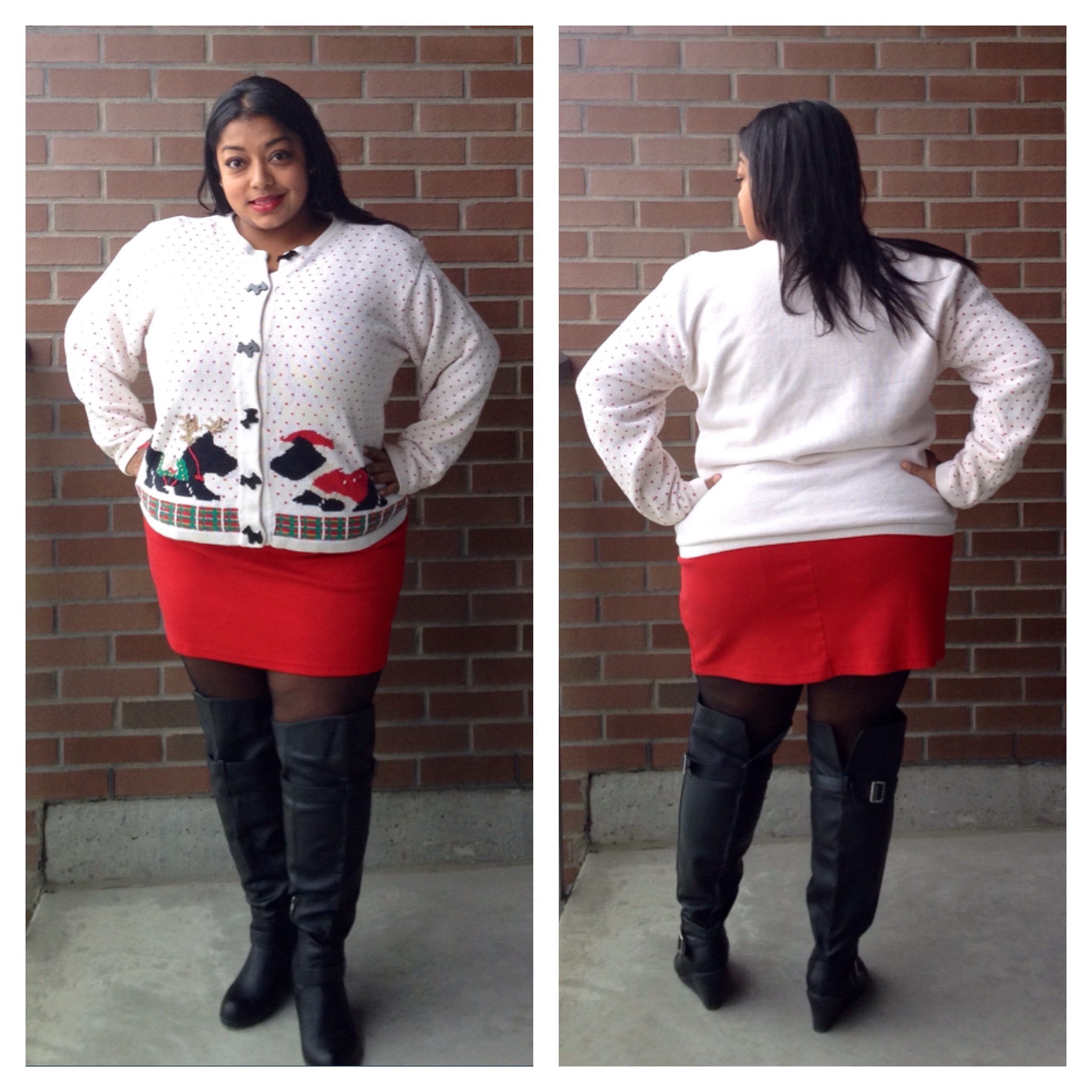 How I Got The Look: I’ve had this Dorothy Perkins mini dress for a while now – I don’t often wear it on its own as it’s uber short and clingy. I typically wear it as a top to show off the amazing shoulder pleats of this dress. But this Christmas red dress paired with this “ugly” holiday sweater, over-the-knee boots (AdditionElle) and sheer black hosiery just seems to work, don’t you think?