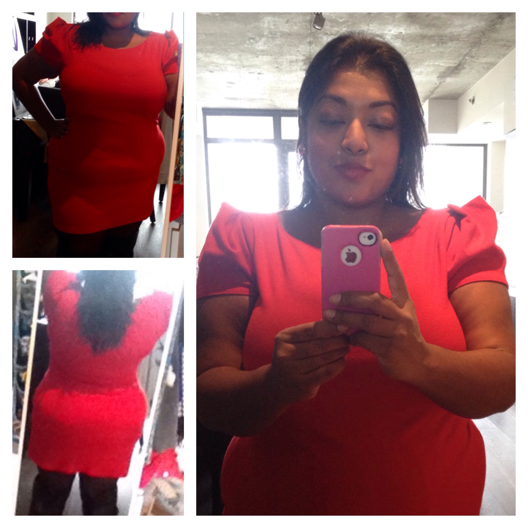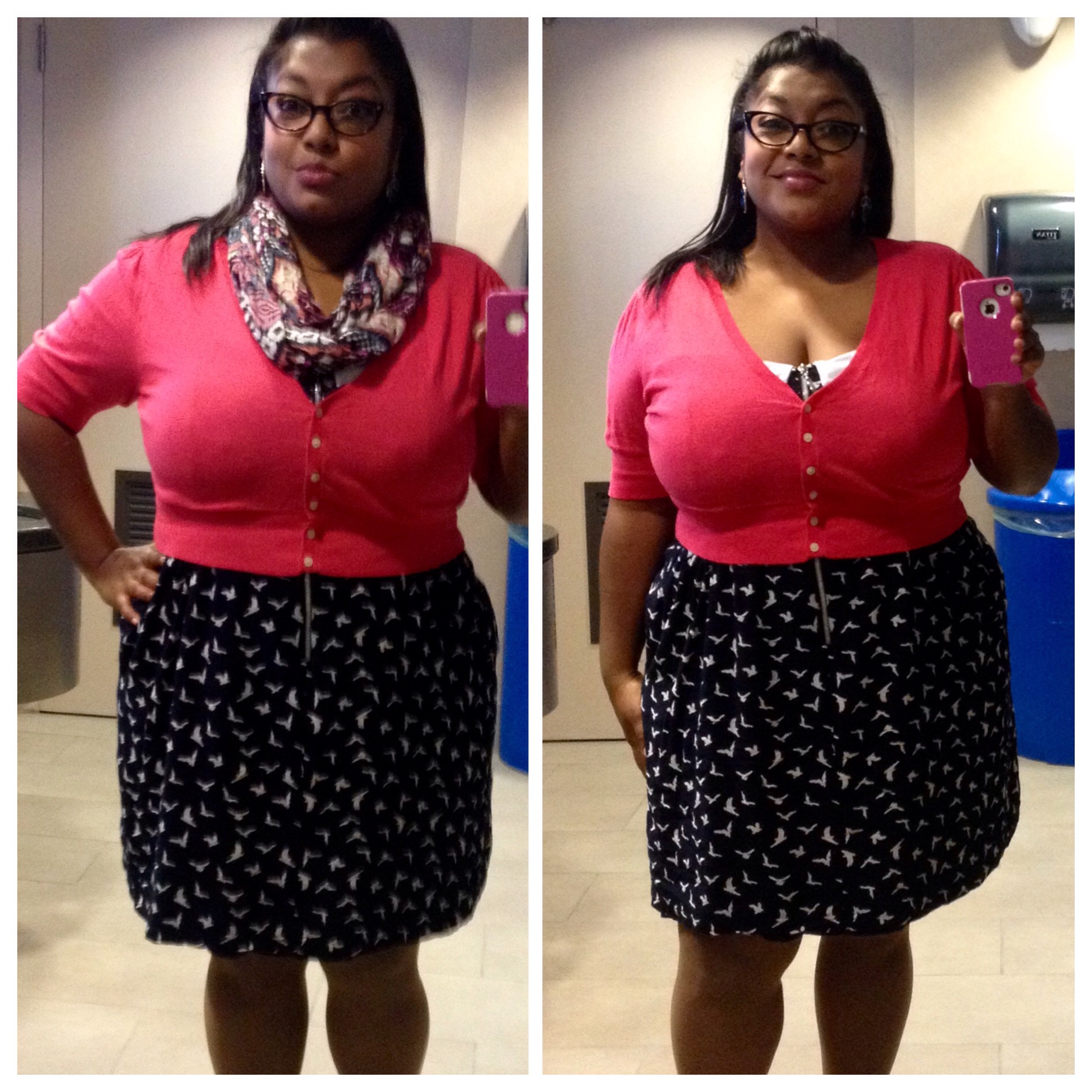 I picked up this sheer bird top during the Spring from Reitmans, from their regular section (it’s an XXL). The berry bandage skirt is from Forever21+ and was cheap-cheap-cheap ($6). The blue sandals were picked up earlier this year on a cross boarder shopping extravaganza.