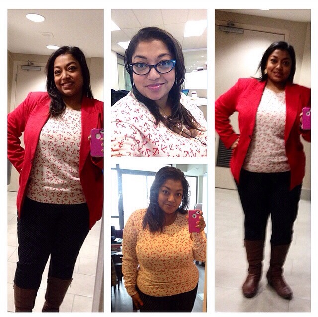 I’ve worn this sweater a ton over the last few months …but I never remembered to take pics for the blog. Monday this sweater made another appearance to the office and I finally snapped a few for this post, combining them with random selfies I’ve taken whist wearing it elsewhere. 🙂 This great red blazer is part of a skirt suit from Sears a few years ago…also scored during Boxing Day sales. The pants are those Diva Old Navy ones you may remember them from my previous post – and I stand by my statement: Best.Pants. Ever!