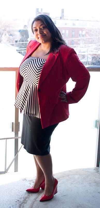 Keeping with my nautical themed post, I’ve often worn this red blazer with a simple black pencil skirt, rather than the red skirt from the suit set…in an effort not to be “too loud” at the office (remember folks…financial-institution-corporate-types don’t appreciate “loud” amongst them in cubical/open-office living…or so I’ve noticed). In an effort to still keep the look interesting, like moi … introducing a sharp pattern or print like this striped strapless peplum really helps me create some noise, without being too “loud” for the office 😉
