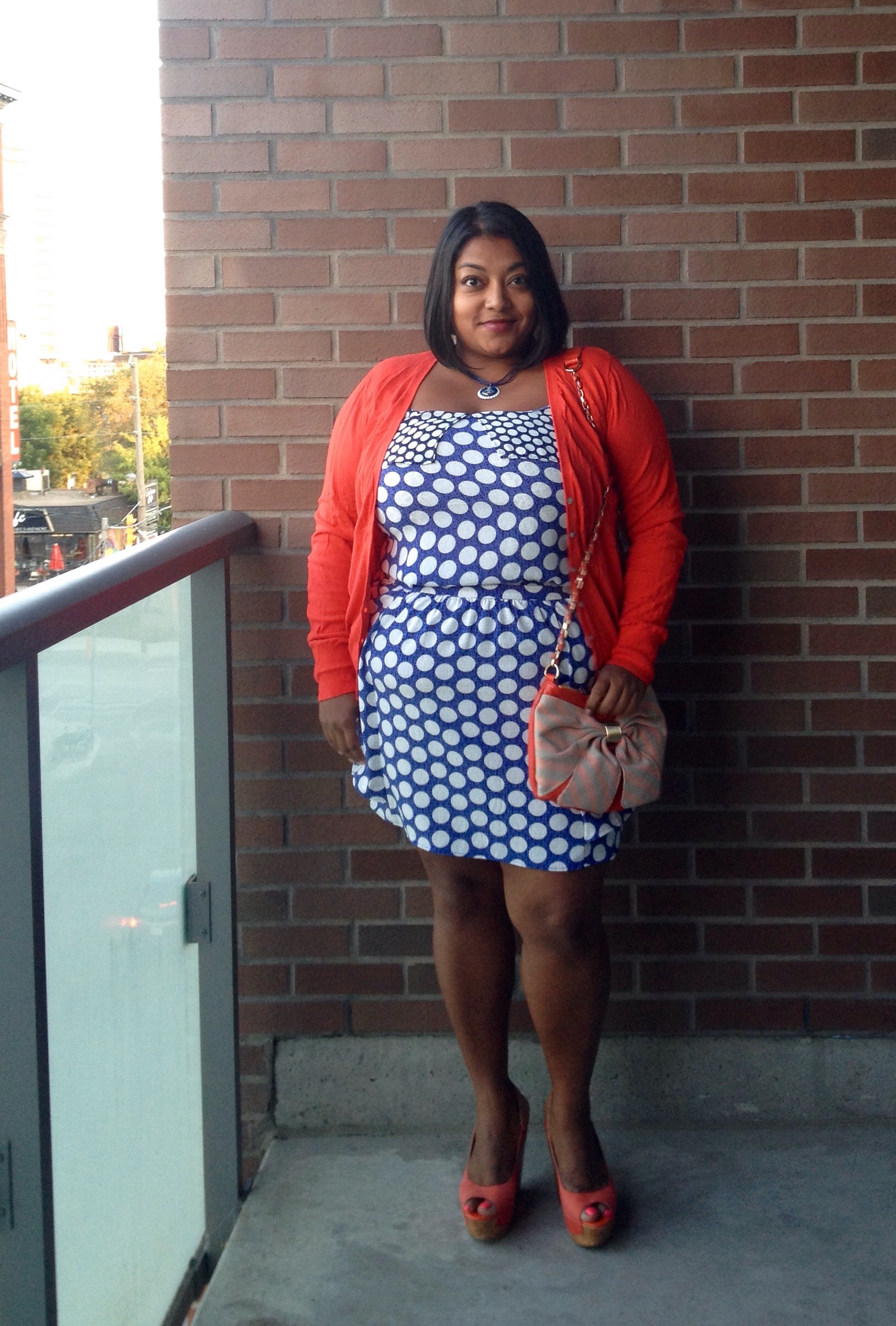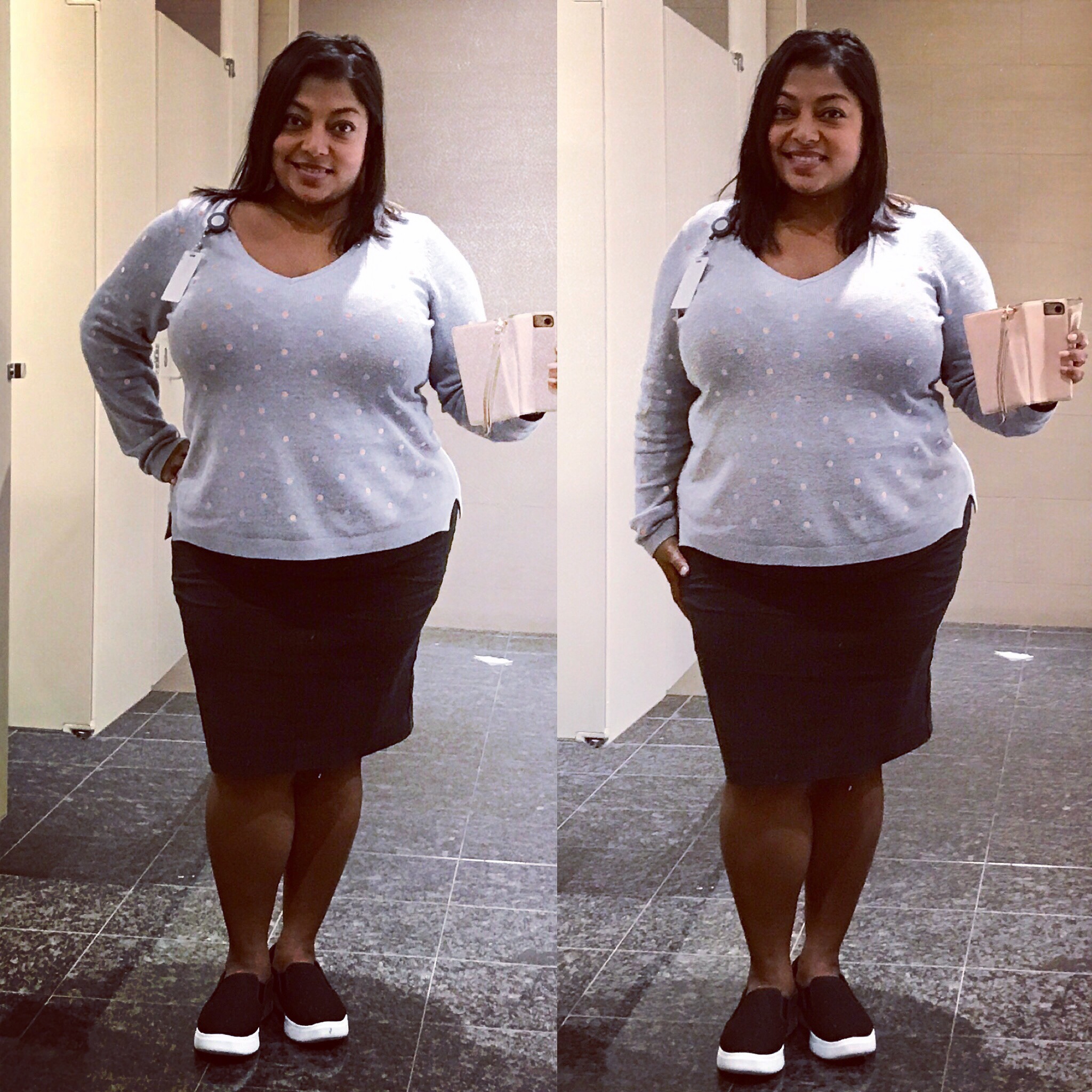 How I Got The Look: This lovely grey sweater has delightful copper embroidered polkadots on it ❤ – from Old Navy; Pencil skirt from Reitmans; Sparkle kicks from Sketchers