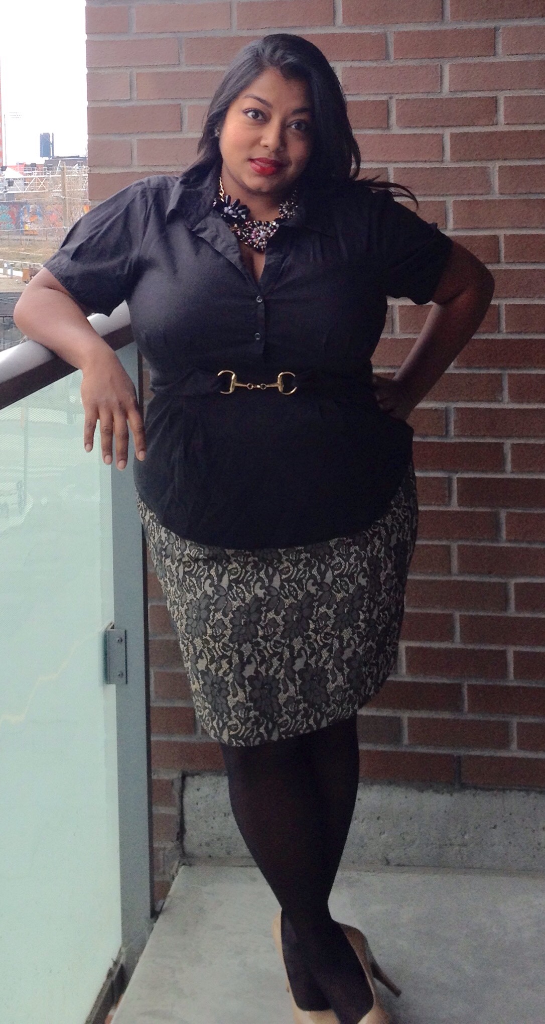 How I Got The Look: Booties, Payless; Jack tights, Torrid; Purse, Kate Spade; Skirt, F21+; Lumberjack plaid, Old Navy; Jewellery, BitterSweet