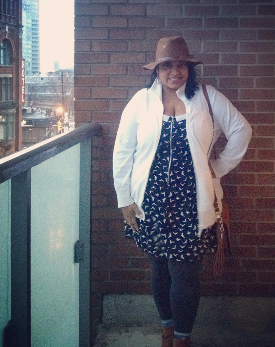 Ok!!! This Cognac brown “Indiana Jones” vibe hat was a whopping $5 buy (Reitmans)!!! Paired with brown booties and a new cross-body hassle purse (The Shoe Company). Bird dress was custom for moi in Vietnam, grey leggings from Old Navy and the long white sweater, is also from Reitmans.